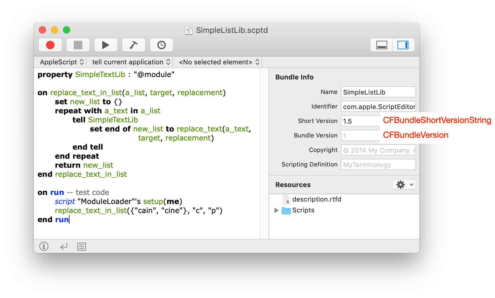 A version number can be stored as a value of "Short Version" or "Bundle Version" in bundle information. "Script Editor.app" is useful to edit bundle information as a following image. When both of "Short Version" and "Bundle Version" exists in bundle information, "Short Version" will be preferred.