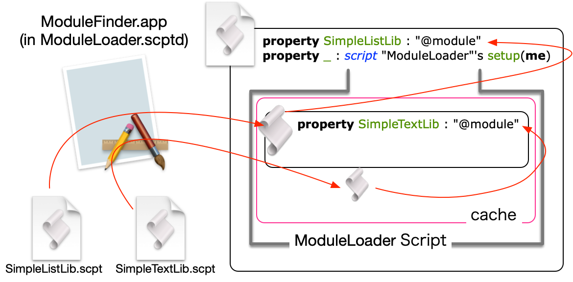 と読み込むライブラリを指定します。ModuleLoader を使って、このスクリプトをライブラリとしてロードした場合、AppleScript Libraries と同様に、SimpleTextLib が読み込まれ、property に設定されます。