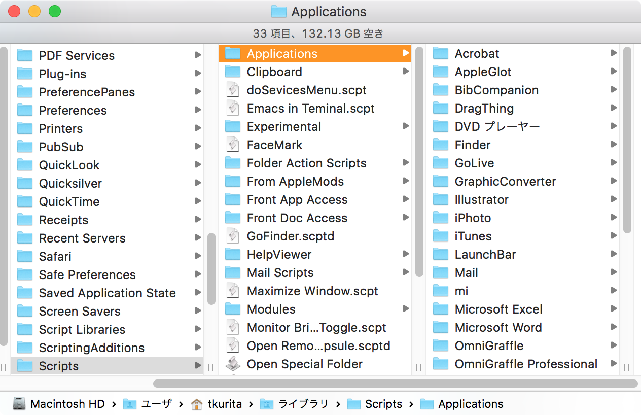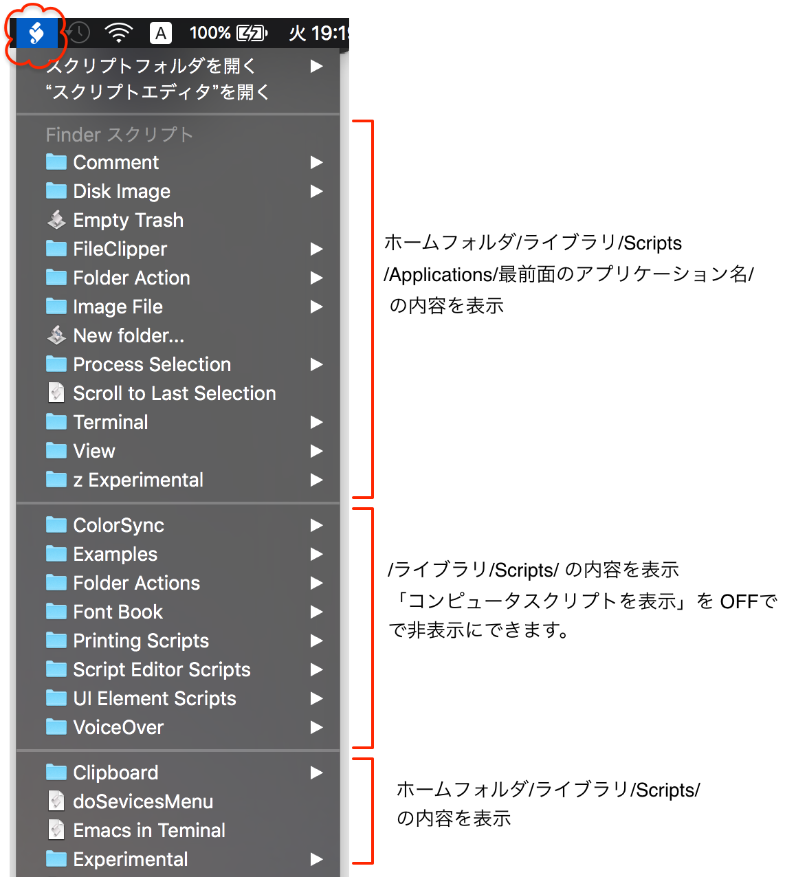 常に表示されるメニュー項目と最前面のアプリケーションによって変わるメニュー項目に分けられています。最前面のアプリケーションに従って内容が変化するメニューを付け加えるには、「ホームフォルダ/ライブラリ/Scripts/Applications」フォルダを新たに作り、その中にアプリケーションの名前の付いたフォルダを用意します。