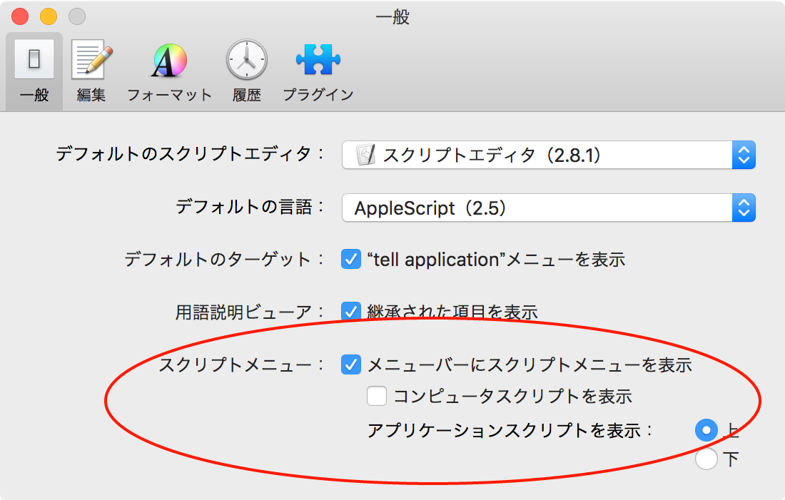 標準の状態にでは有効になっておらず、スクリプトエディタの「環境設定」でメニューバーにスクリプトメニューを追加することができます