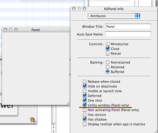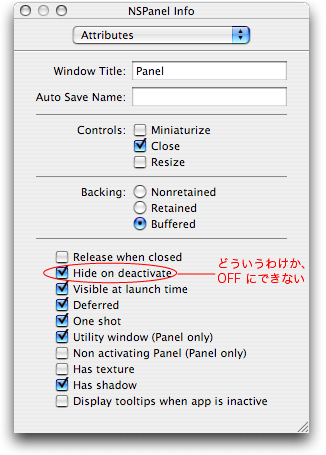 「Utility Window」を On にすると、自動的に property「floating」と「hides when deactivated」が true に設定されます。またどういうわけか、Interface Builder で「Hide on deactivate」を Off にできなくなってしまいます。