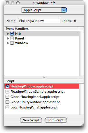 僕が知っている AppleScript Studio で Floating Window を作る方法をまとめます。AppleScript は他のアプリケーションをコントロールしてなんぼですから、他のアプリケーションのインターフェースに寄生する方法は重要でしょう。その一つとして最も自由度が高いのが Floating Window ではないでしょうか。残念ながら AppleScript Studio で真の Global Floating Window は作れませんが、近いものを作る事はできます。