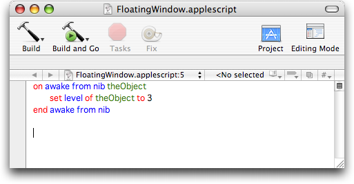 普通の window の level は 0です。window の level を 0 以上にしてやれば、すべてのアプリケーションの window の上に表示される window を作る事ができます。window がどの level に属すべきかは決まっているようで、Floating Window の場合は「3」のようです。AppleScript Studio の Reference の Window Class の解説部分に記述があります。