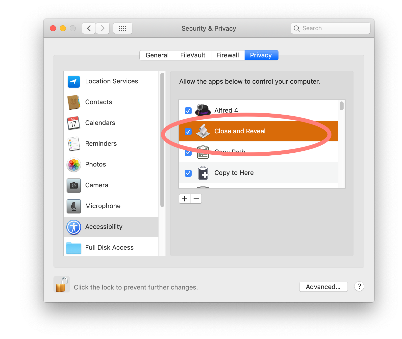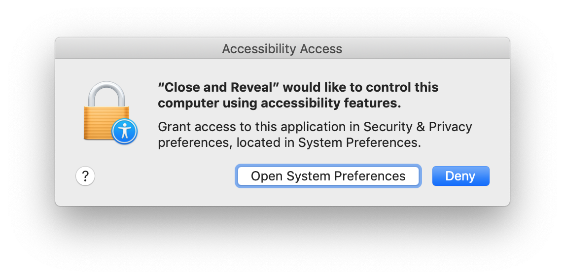 Pressing "Open System Preferences" cause to open "System Preferences" and to add the applicaiton into the "Accessibility" list of the "Privary" tab of the "Secutiry & Privacy" pane. Turn the check box of the application on.