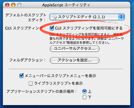 Mac OS X 10.4 では、GUI スクリプティング を使用可能にする必要があります(Mac OS X 10.5 では必要ありません)。AppleScript ユーティリティを使って設定してください。