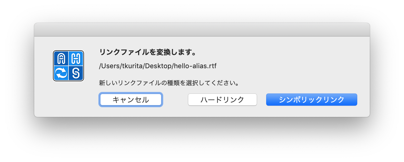 Finder でエイリアスファイルを選択して実行すると、相互に変換する事ができます。実行すると、以下のようなダイアログが表示されます。「シンボリックリンク」ボタンを押すと、エイリアスファイルはシンボリックリンクに変換されます。また、「ハードリンク」ボタンを押すとハードリンクに変換できます。