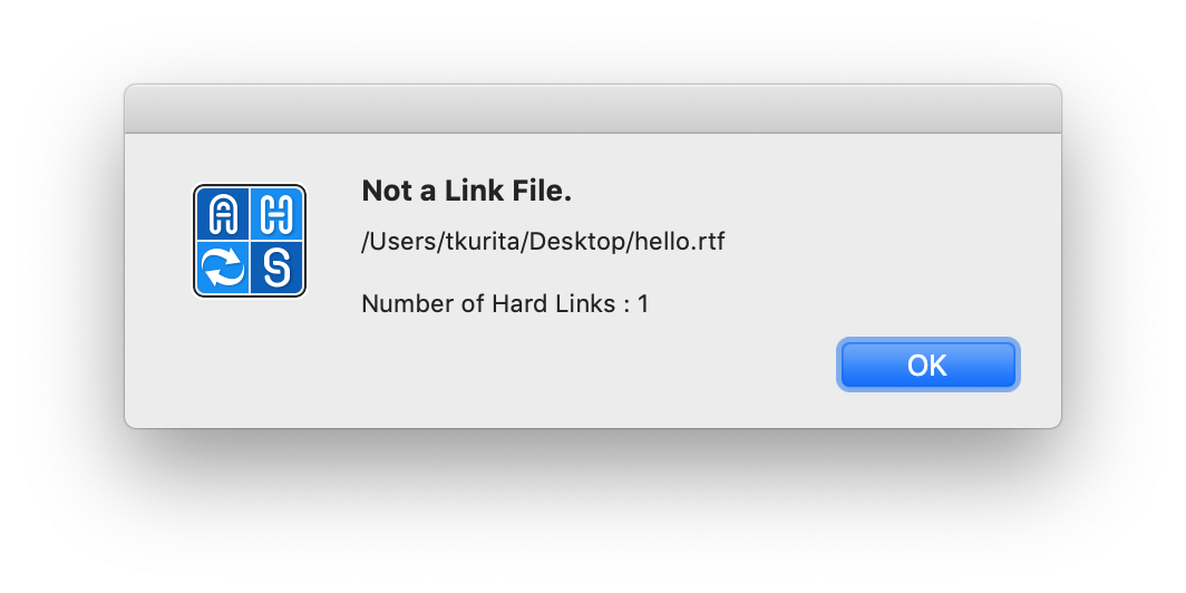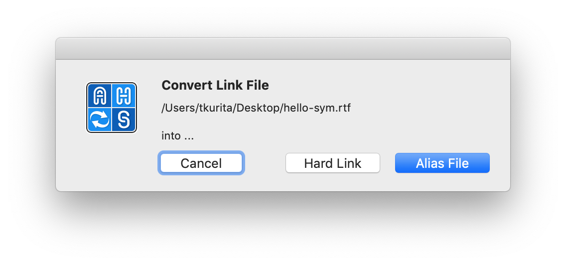 The following dialog will be displayed by launching LinkFileConverter when an alias file is selected in Finder. Pressing “Symbolic Link” button causes to convert selected alias file into a symbolic link. Pressing “Hard Link” causes to convert it into a hard link.