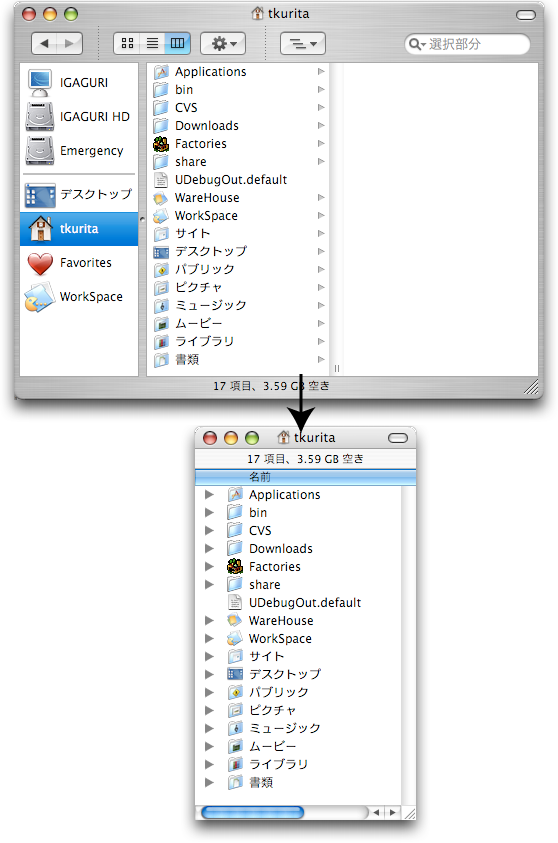 最前面の Finder Window を「ツールバーの無い名前欄だけのリスト表示」に変更します。現在の作業フォルダとして Finder で常に開いておきたいときは、一覧性が良く、なおかつ省スペースな名前欄だけのリスト表示が便利なのではと思います。