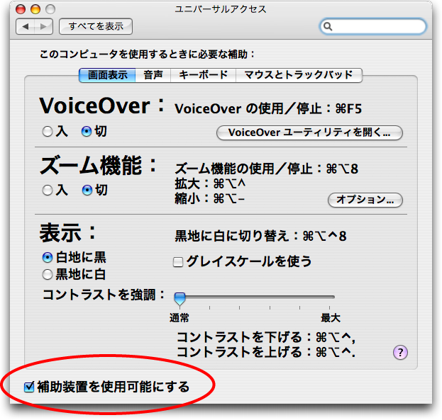 Mac OS X 10.4 では、システム環境設定の「ユニバーサルアクセス」で「補助装置を使用可能にする」を ON にして、GUI スクリプティングを有効にする必要があります。Mac OS X 10.5 では、必要ありません。
