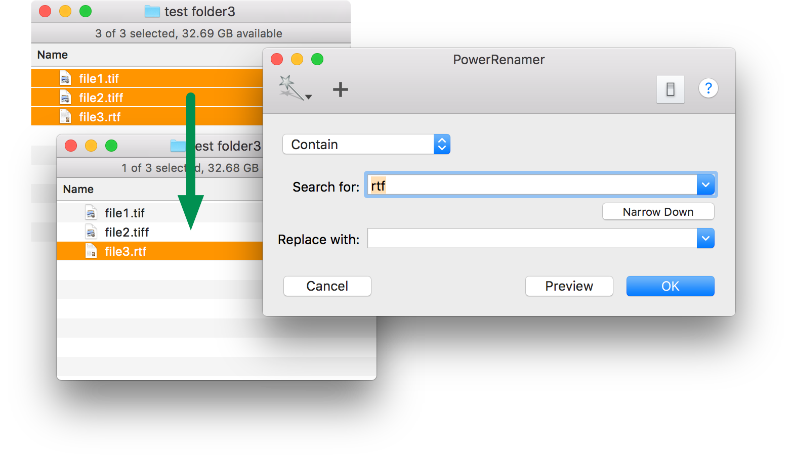 Also PowerRenamer can narrow down selection in Finder to help specifying files to be renamed. A condition to narrow down selection is expressed by the mode popup menu and the text in "Search for" field. Pressing "Narrow Down" button cause to reselect files which are matched with the condition in selected files in Finder.
