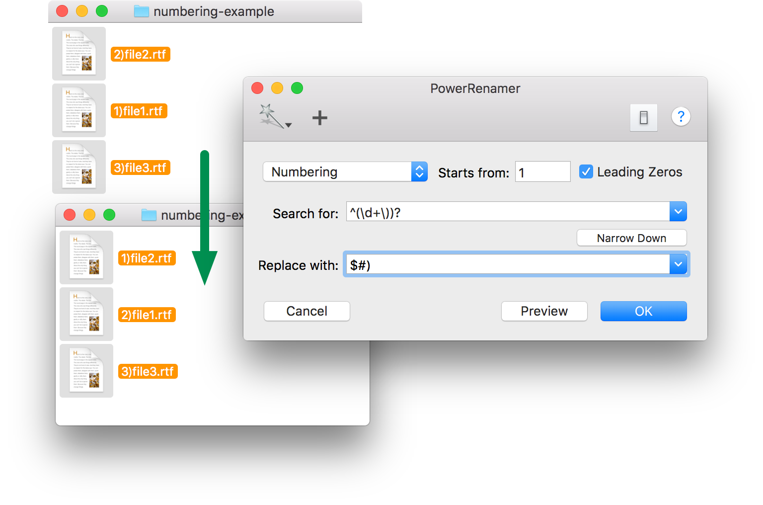 If you specify files to be renamed by using the service menu or dropping files on the application icon, numbering order is determined by the list order in the preview drawer.