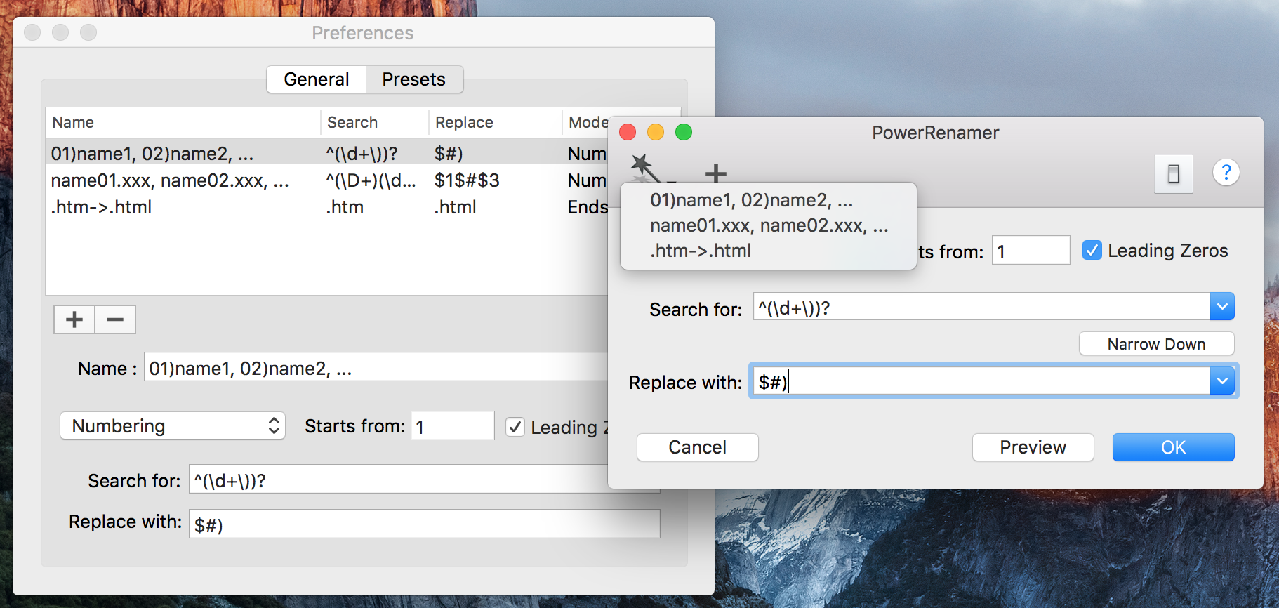 PowerRenamer can save settings as a preset. You can have multiple presets and there are loaded from a toolbar of a window.