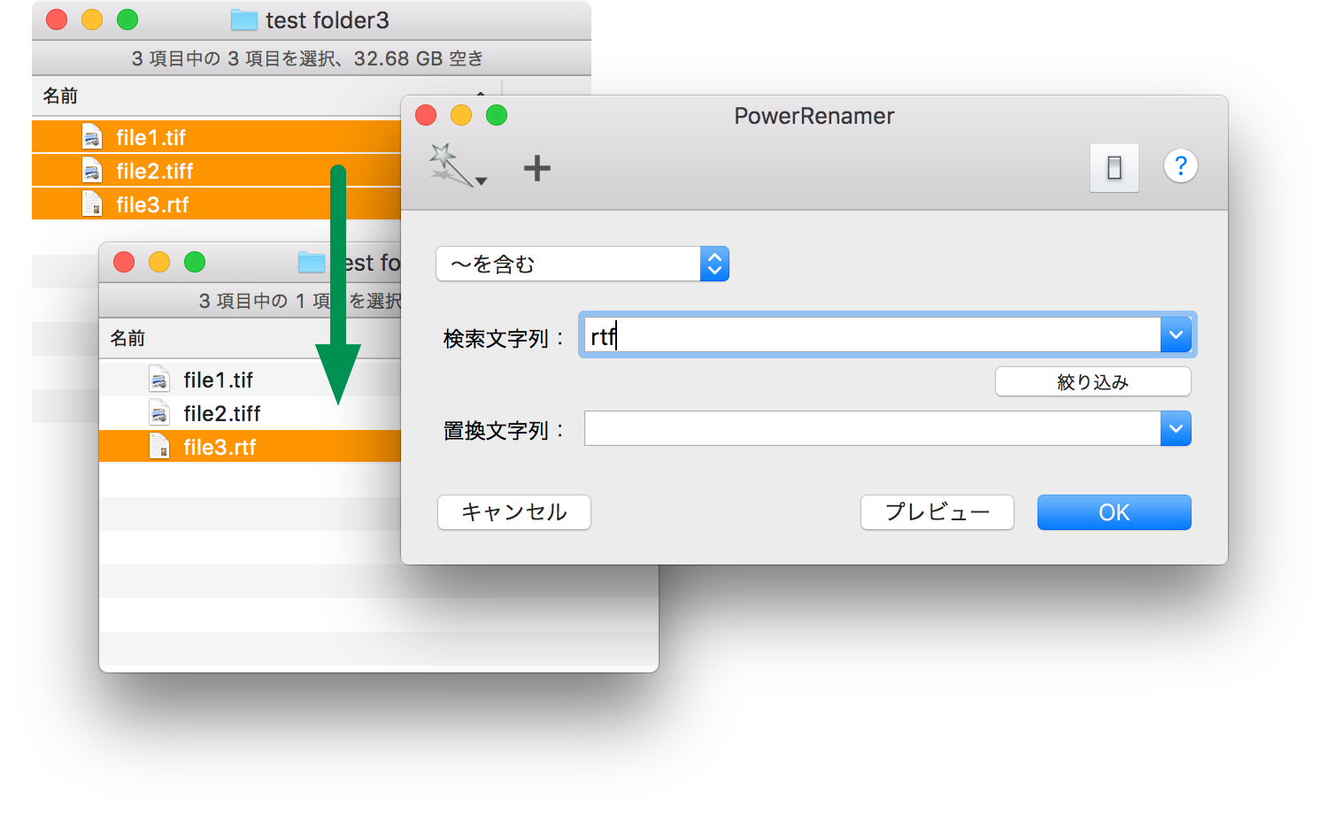 PowerSelect はさらに、選択されたファイルから条件にあった項目だけを選別して、あらたに選択項目とすることができます。検索モード、検索文字列を入力して、「絞り込み」ボタンを押してください。「絞り込み」ボタンには、ショートカットキーとして「⌘K」が割り当てられています。
