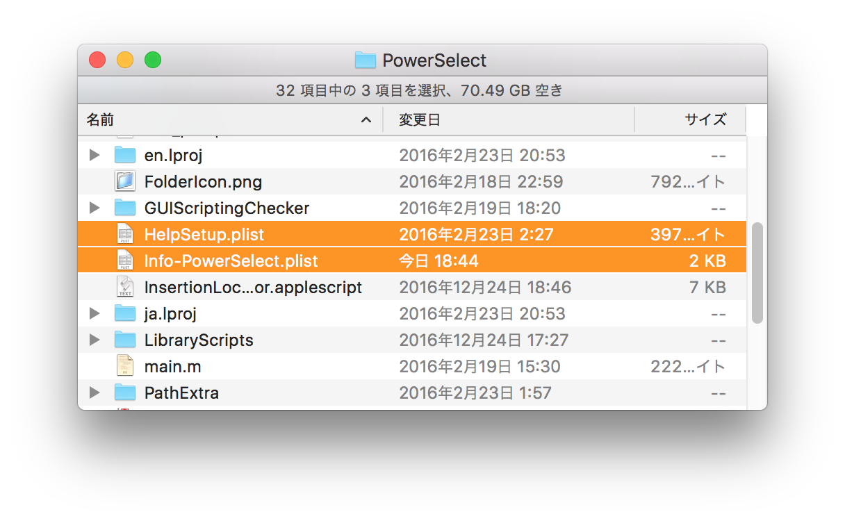 リストボックスで、いくつかの項目を選択しすると、「選択」ボタンが使えるようになり、リストボックス中で選択された物だけを Finder で選択する事ができます。