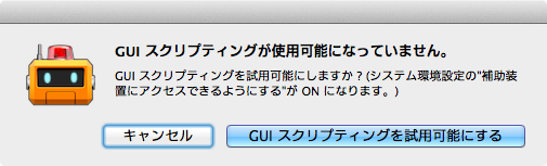 GUI スクリプティングが OFF になっている状態で起動すると、GUI スクリプティングの ON を許可を求めるダイアログが表示されます。管理者のパスワードの入力が必要です。
