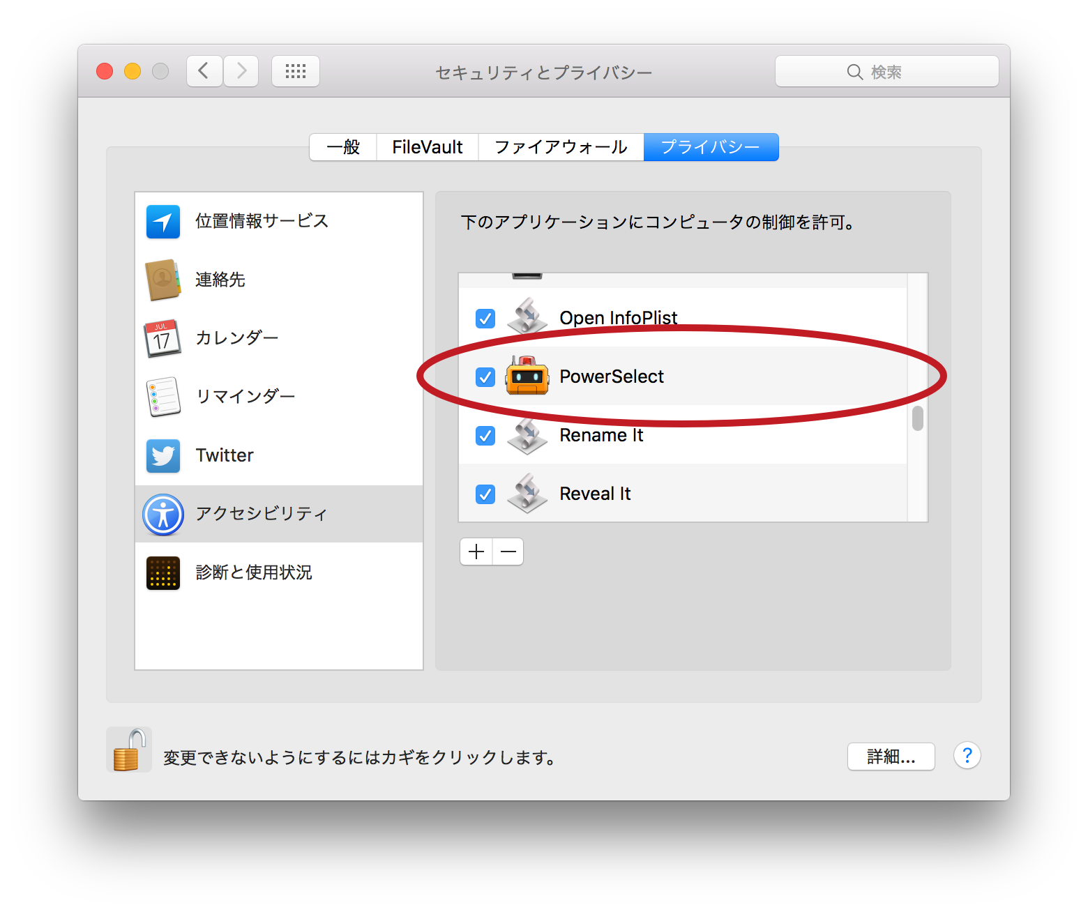 ここで、「システム環境設定を開く」を選択してください。すると PowerSelect は一度終了します。アクセッシビリティの「下のアプリケーションにコンピュータの制御を許可」に PowerSelect がリストされているはずです。ここでチェックボックスを ON にすると、このダイアログは表示されなくなり使用できる状態になります。