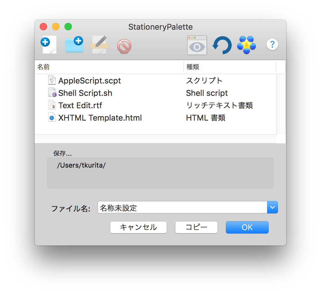 - サービスメニュー「フォルダにテンプレートから新規ファイル」を追加。従来のサービスメニュー「テンプレートから新規ファイル」と同じです。コンテキストメニューから StationeryPalette を呼び出すために使ってください。