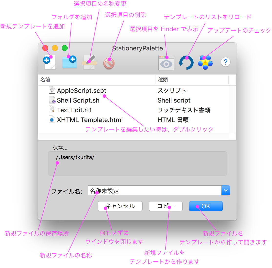 テンプレートの順番の並び替えはドラッグ&ドロップで行えます。その他、削除、名前の変更など、テンプレートの管理に必要なことはすべてこのウィンドウの中で行うことができます。さらに、Finder のようにテンプレートの名前をキーボードで入力することにより、テンプレートの選択が行えます。