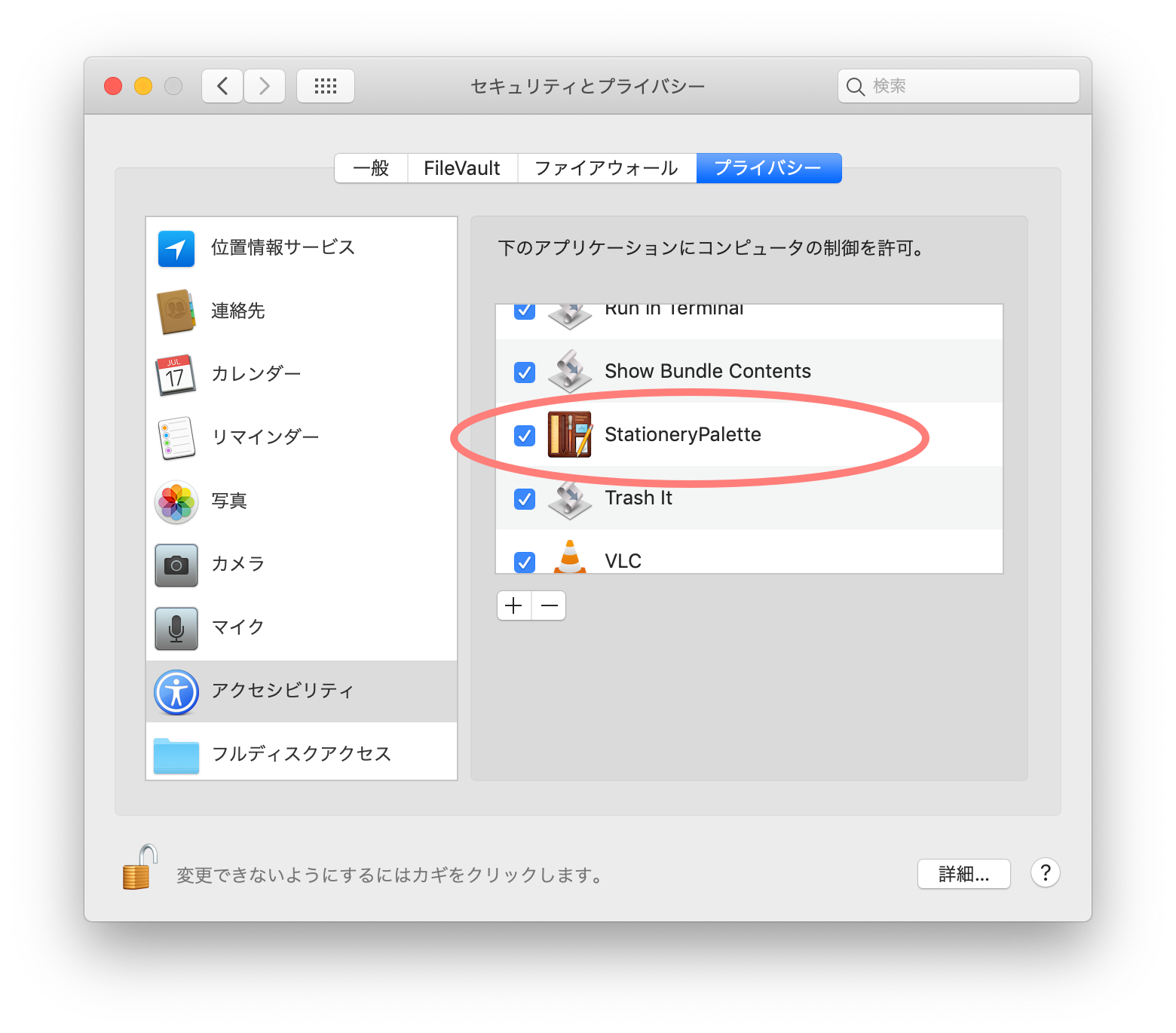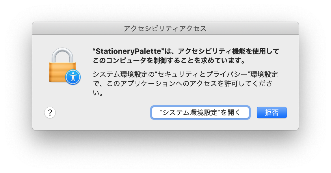 ここで、「システム環境設定を開く」を押すと、システム環境設定の「セキュリティーとプライバシー」パネルの「プラバシー」タブのアクセシビリティに起動したアプリケーションが追加されています。チェックボックスを ON にしてください。