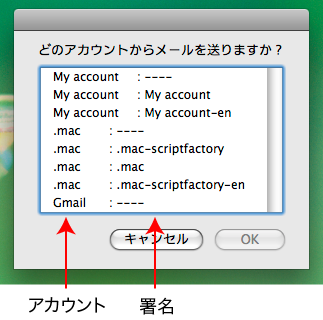 Mac OS X に含まれているメールソフト Mai.app で、アカウント(送信元のメールアドレス)と署名を指定して新規メッセージを作る AppleScript です。