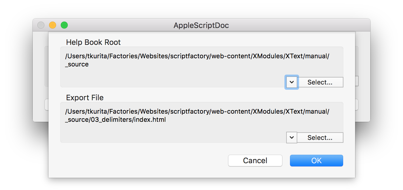 Clicking "Export Help Book" causes to display the following dialog. In this dialog, the root folder of the Help Book and destinatin of the reference manual to export can be specifyed.