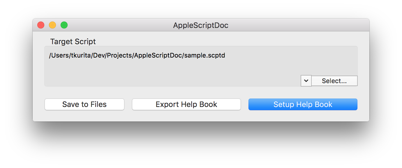 After launching, AppleScriptDoc will open the following window. In this window, you can specify an AppleScript to process and choose an output method.
