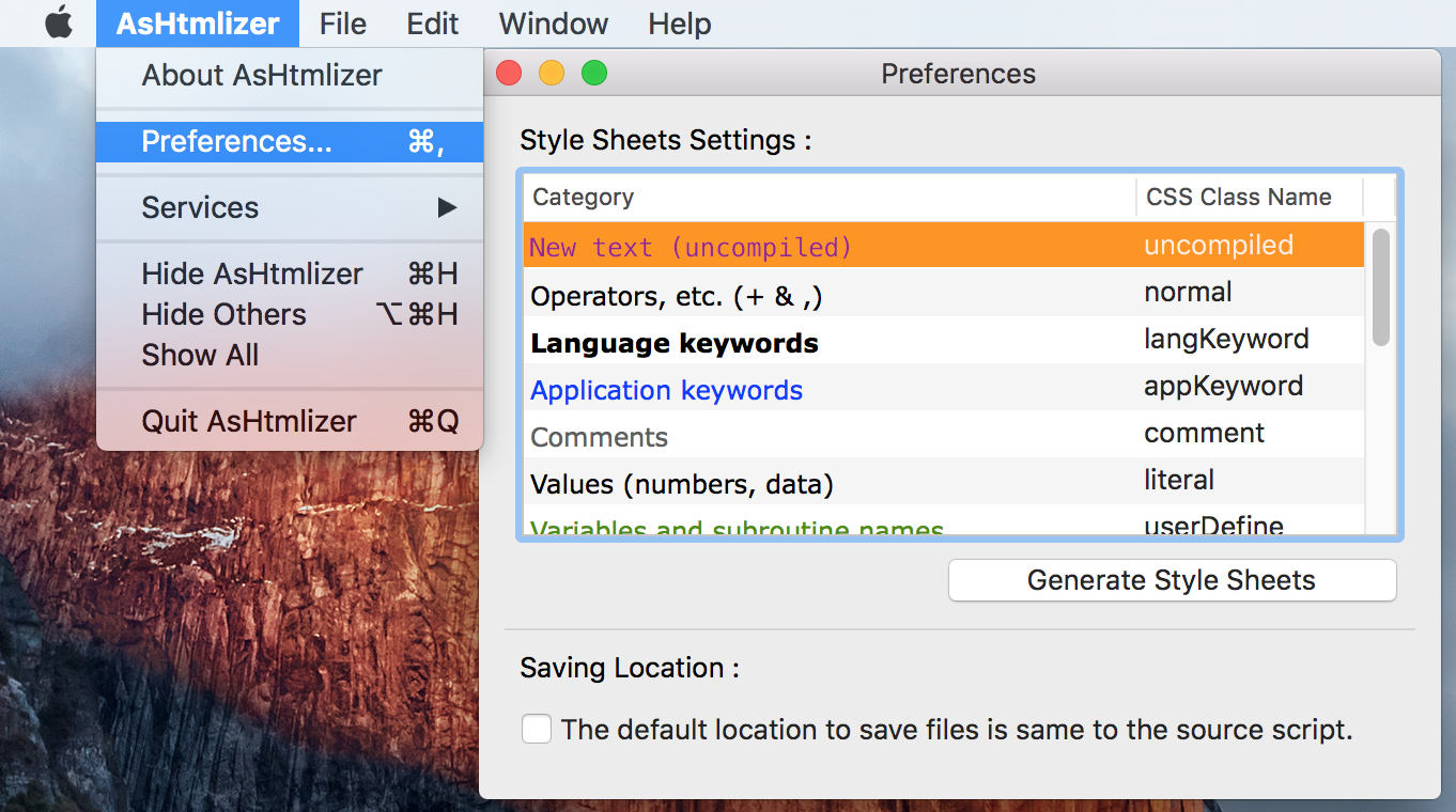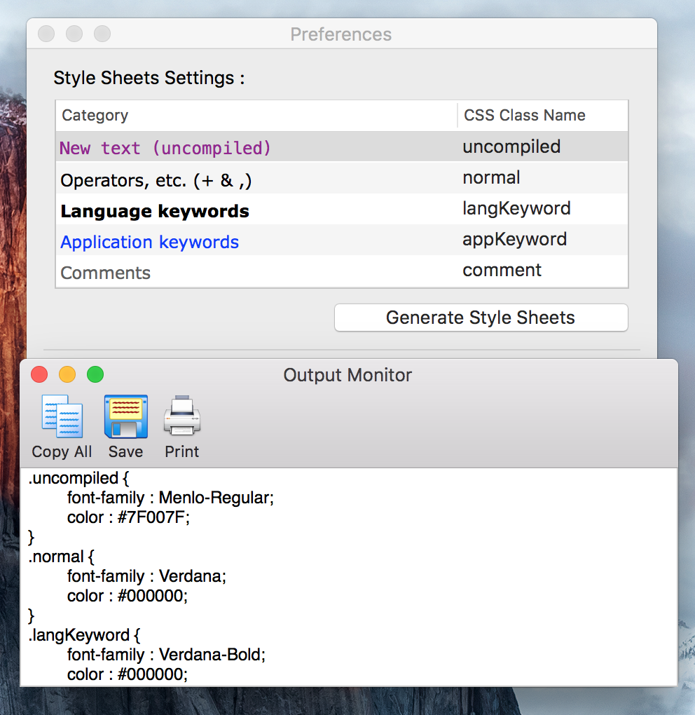 When "Internal" is selected, CSS will be placed in the head element. Each tags of AppleScript code have CSS class names which are set in the "Preferences" window.