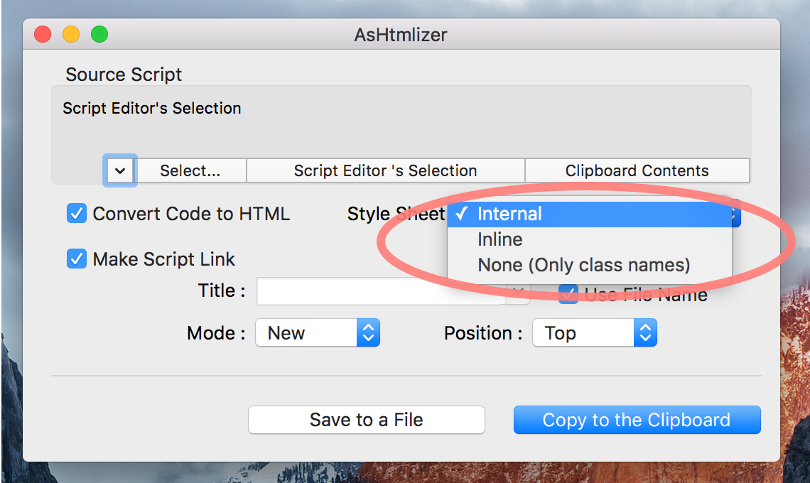 When "Inline" is selected, CSS will be inserted into each HTML tags. This mode cause to generate dirty HTML, but a CSS setting in the head element is not required. This mode may help to post AppleScript code into blog services which can't customize external CSSs.