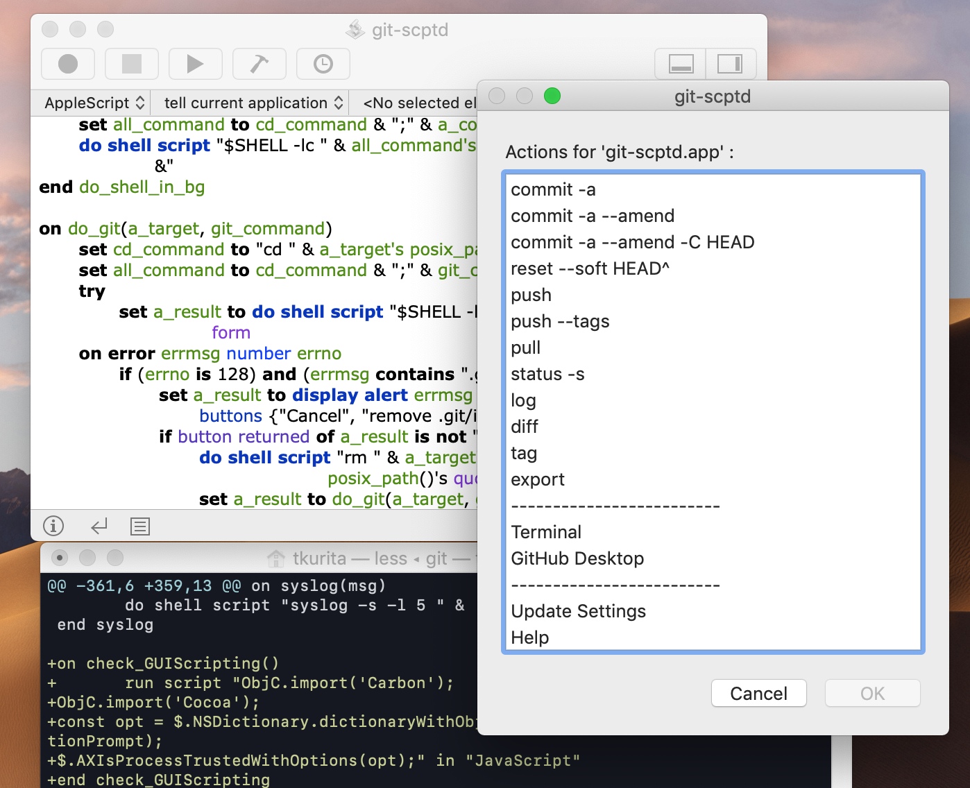 git-scptd is an utility to help manage AppleScript bundles in version control system using git. The features are follows.