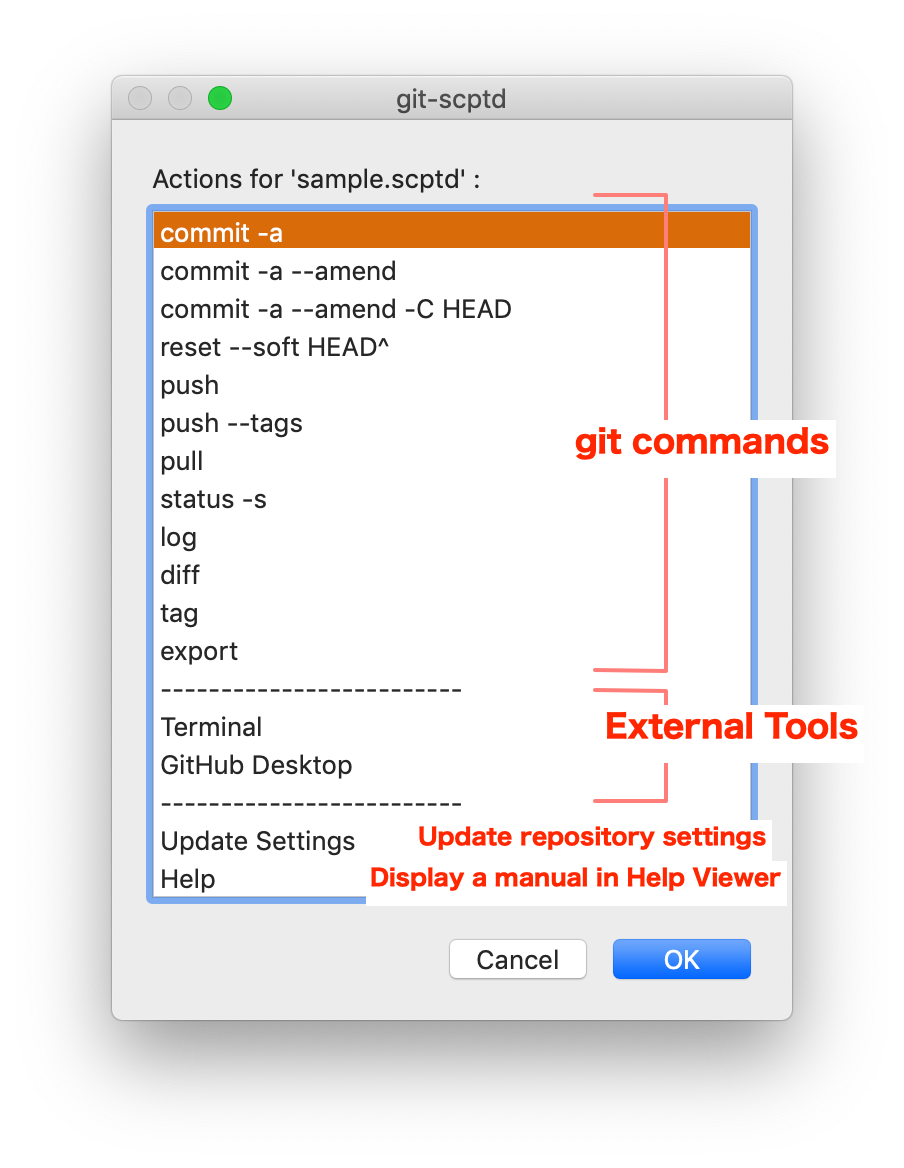 Pressing the "OK" button cause quitting "git-scptd". Pressing "Next Action" button cause displaying the command menu for the next action.