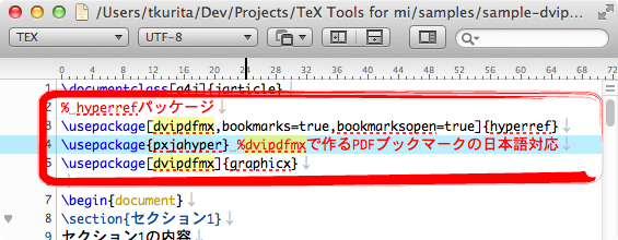 最終的に dvipdfmx を使って DVI を PDF に変換するときは、プリアンブル宣言部は、最低限以下のようにするとよいでしょう。