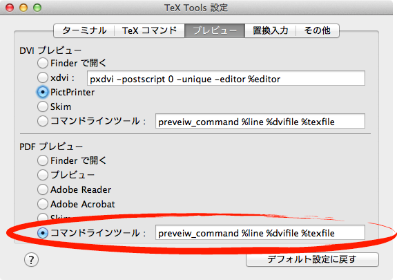PDF ファイルのプレビューの動作として、コマンドラインツールの実行を選択することができます。TeX Tools for mi が組み込みで想定していないツールを設定するために使ってください。