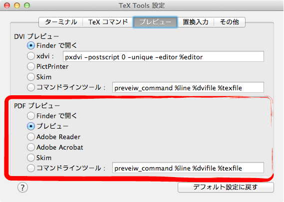 ツールコマンド「タイプセット & PDF プレビュー」、「DVI を PDF に変換」「PDF ファイルを開く」でPDF ファイルを開くアプリケーションの設定画面は、ツール「TeX Tools の設定」で開くことができます。