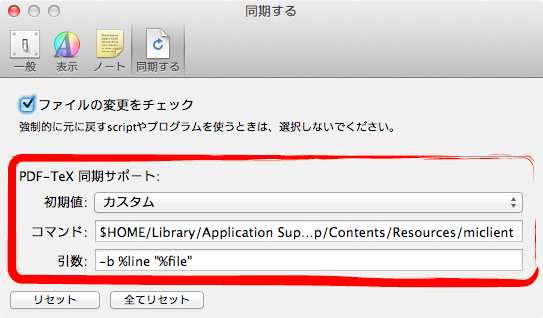 コマンドは、ログインシェルの中で実行されるので、ログインシェルの環境変数が適切に設定されていれば、コマンドのフルパスを書く必要はありません。コマンド中の %line, %pdffile, %texfile は次のように置き換えて実行されます。