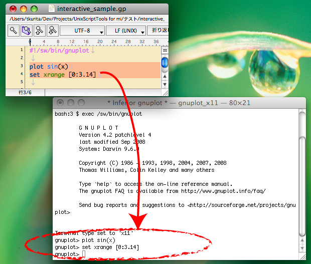 - ターミナルで実行できるスクリプトでしたら、どんなもの(例えば gnuplot、octave)でも扱う事ができます。
