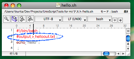 上記の例では、出力先をファイル「helloout.txt」にリダイレクトしています。パイプで他のコマンドに渡す事もできるでしょう。