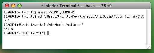 mi でスクリプトファイルを開いた状態で、インストールしたツール「実行:結果をターミナルで表示」を実行すると、以下のようにターミナルが起動しスクリプトが実行されるはずです。