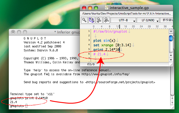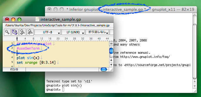 ターミナルで起動している対話型プロセス(例えば gnuplot や Octave のように独自のコマンドラインインターフェースを提供するアプリケーション) に mi で選択しているテキストを送って実行することができます。