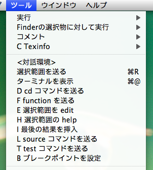 選択テキストのヘルプをターミナルで表示します。つまり、「help "選択テキスト"」 というコマンドを Octave が起動しているターミナルに送信します。function の使い方を確認したい時に便利です。