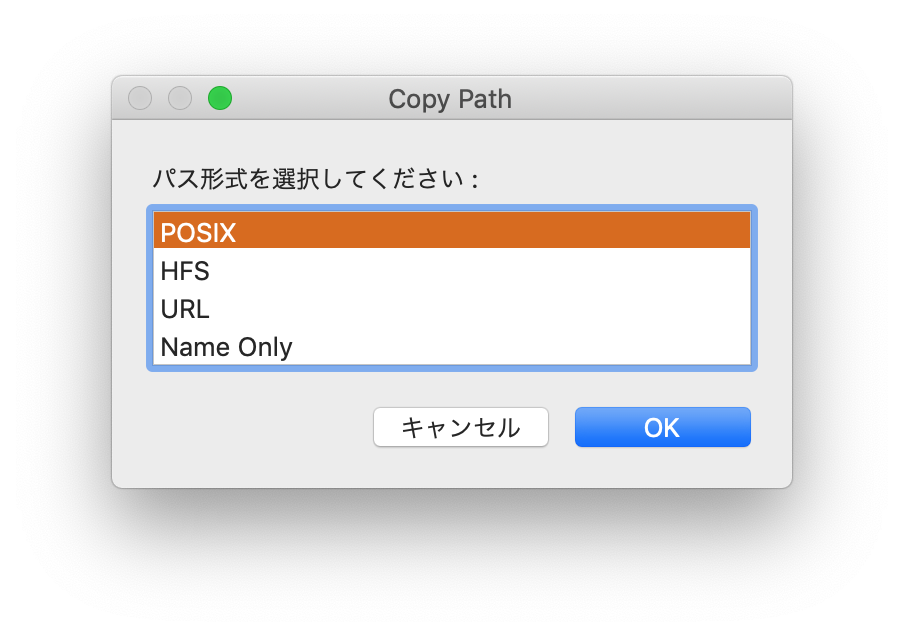 選択された形式のパスがクリップボードに入れられます。Finder が前面にある場合は、Finder で選択されている項目を、それ以外のアプリケーションの場合は開いている書類のパスを取得します。