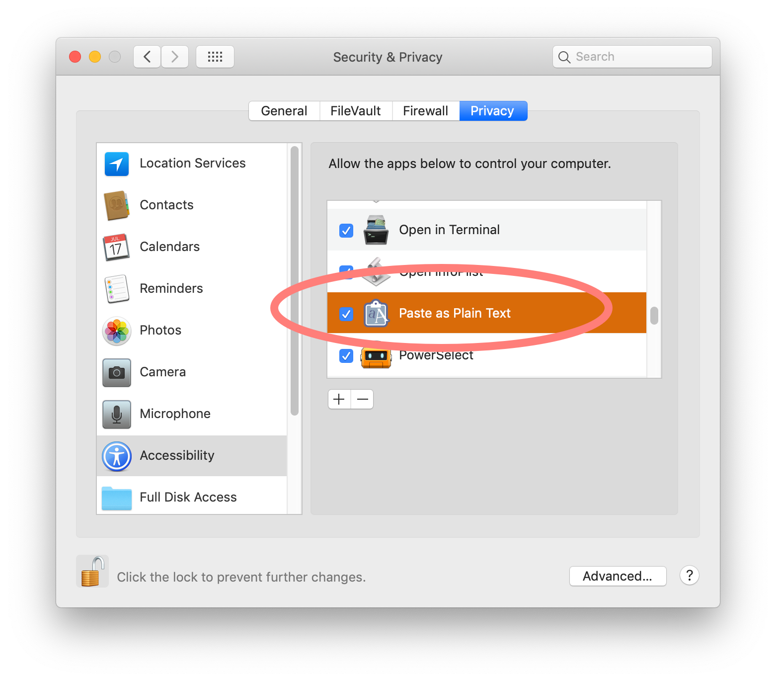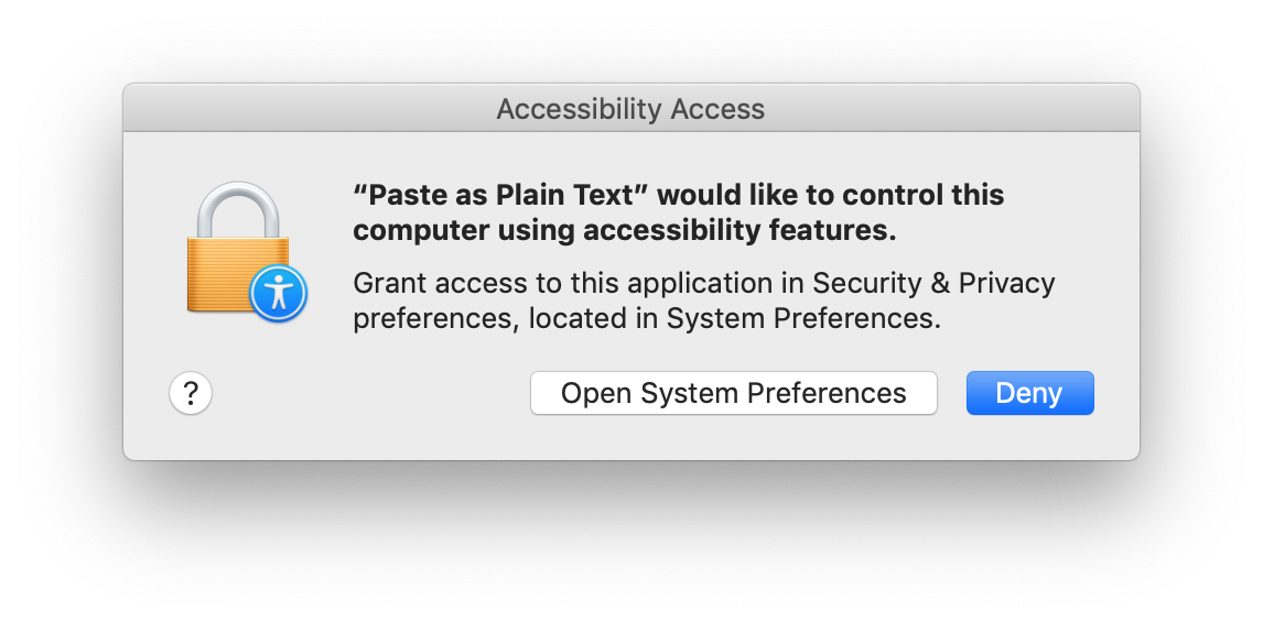 "Paste as Plain Text" require permission to control your computer using accesibility features (GUI Scripting). When the application is launched at the first time, following dialog will be displayed.