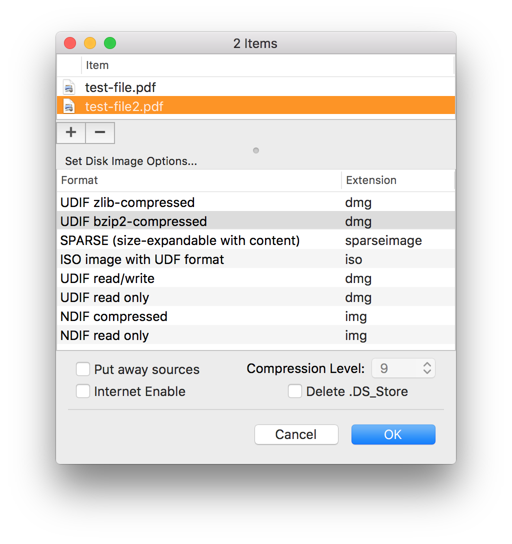 - .DS_Store (Invisible files created by Finder) are deleted from the resulting disk image.