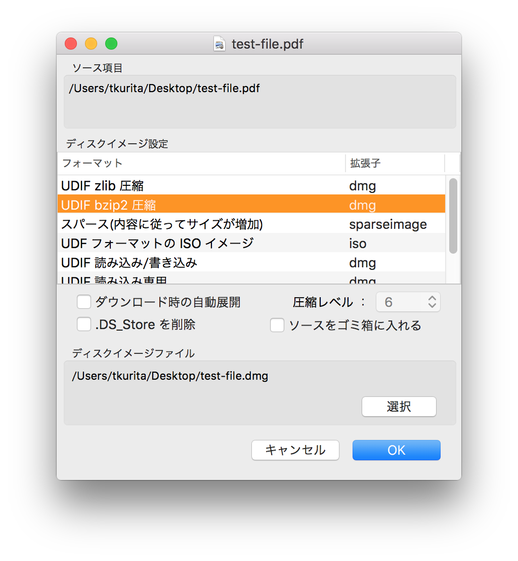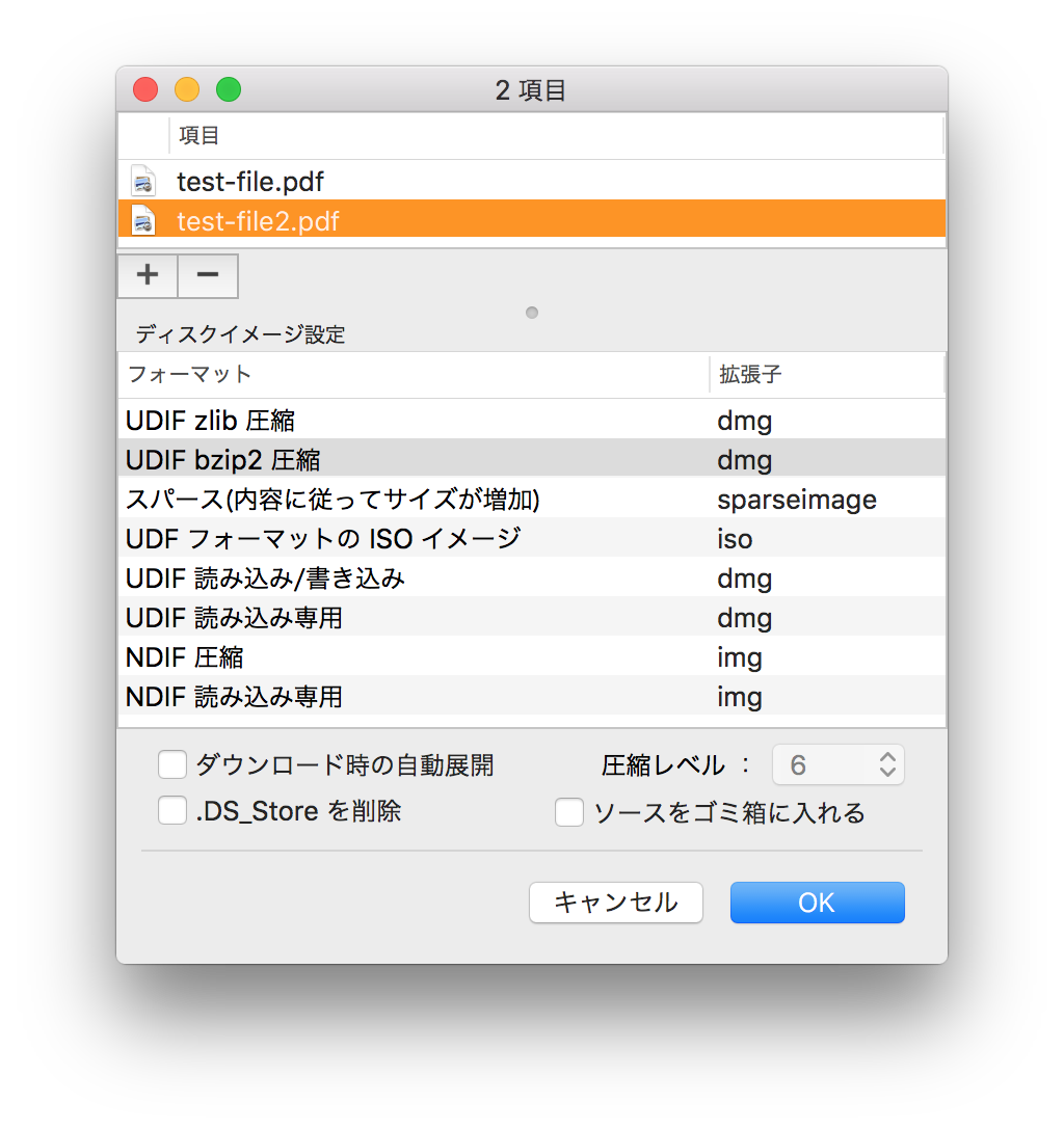 - 「UDIF zlib 圧縮 」でディスクイメージを作成する際の圧縮レベルを設定します。数が大きいほど圧縮レベルが高く(ディスクイメージのサイズが小さく)なります。