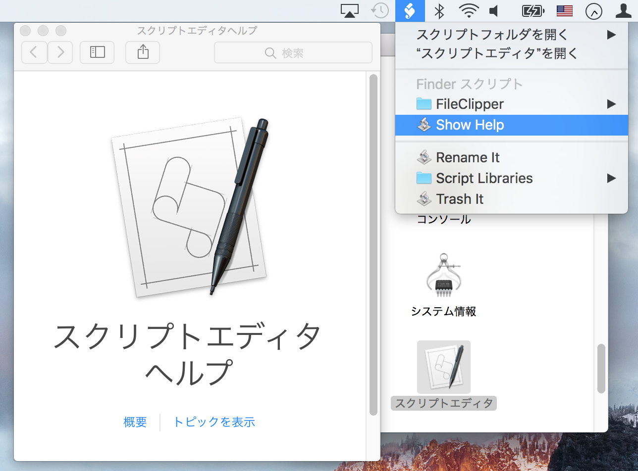 アプリケーションのヘルプを表示する為には、起動してヘルプメニューから項目を選択する必要がありますが、Show Help を使えば、アプリケーションを起動しなくてもヘルプを表示させることができます。