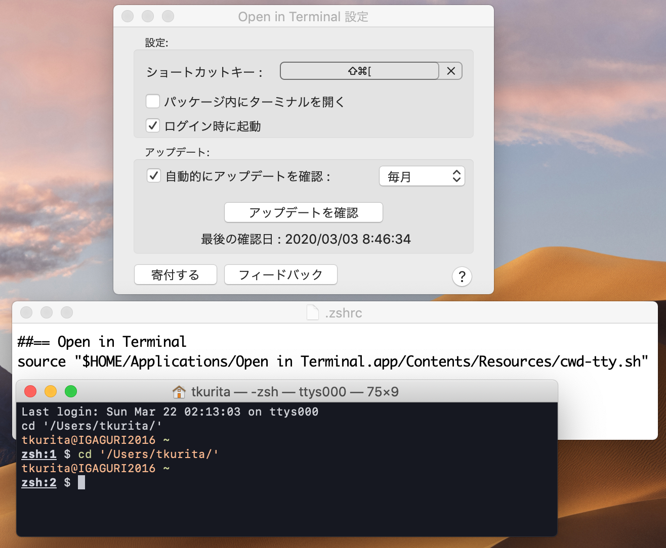 - macOS 10.12 以降では、エージェントアプリケーション起動時に自身が active になり、前面のファイルパスが取得できなくりました。そこで、ショートカットキーを用いてターミナルを開く仕様に変更しました。起動動作では、新たに追加した設定ウインドウが開きます。