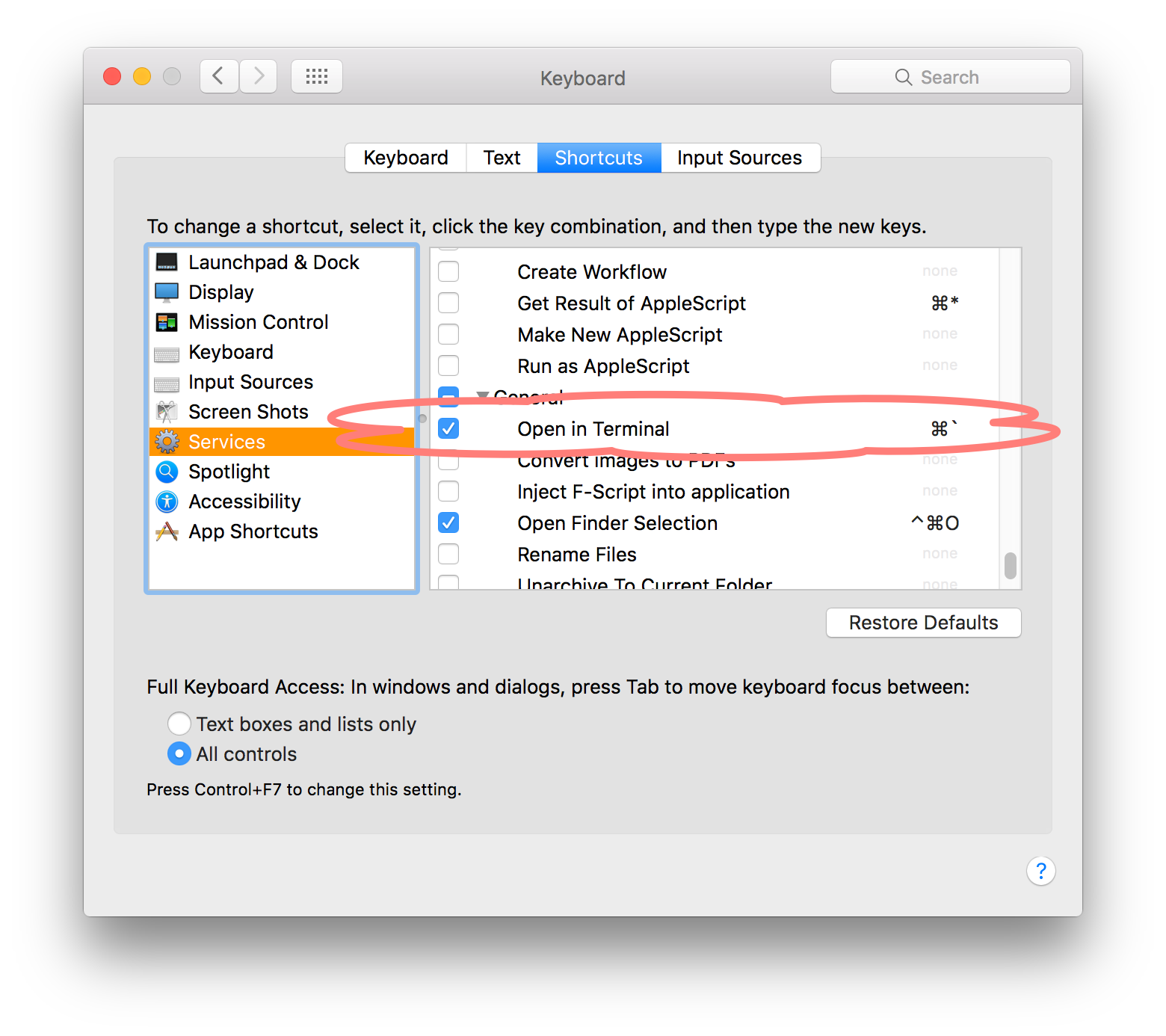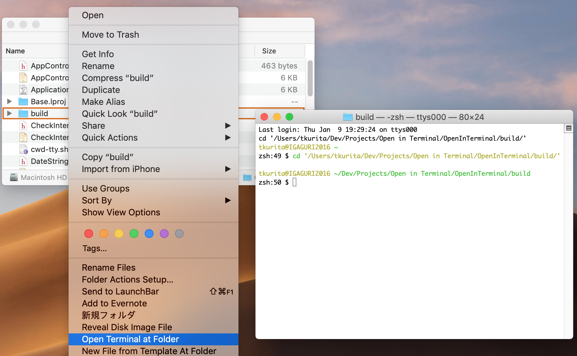 "Open in Terminal" provides a service menu "Open Terminal at Folder". The services menu is useful to open a terminal for a selected folder in Finder from contextual menus.