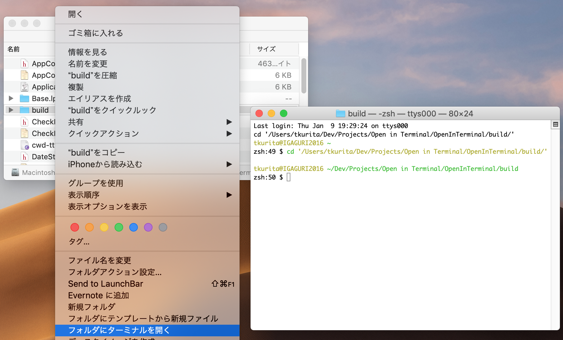 Open in Terminal は、サービスメニュー「フォルダにターミナルを開く」からも使うことができます。コンテキストメニューから実行すると良いでしょう。
